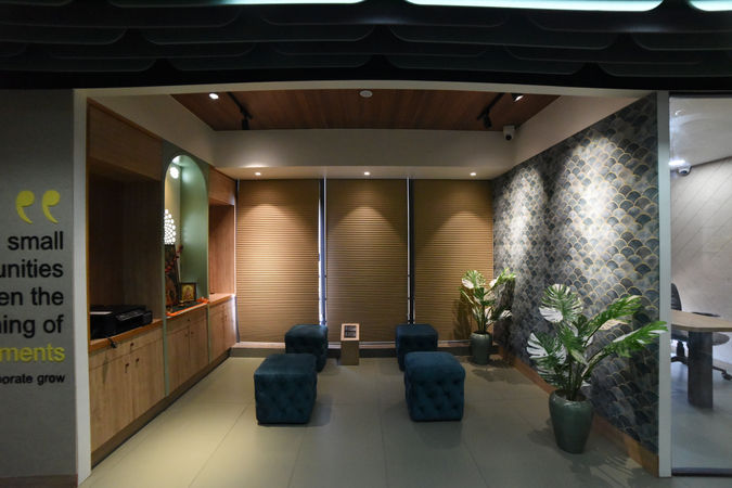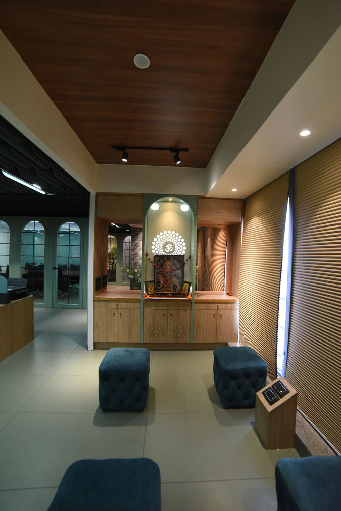 A 1,950sq.ft. luxury head office for our prestigous clients Preksha Interiors Pvt. Ltd. at Aaron Spectra, Ahmedabad. The office has 1 director's cabin, 2 partner cabins, 2 senior cabins, 12 staff members, one conference room, one accounts cabin, pantry, reception and waiting area.