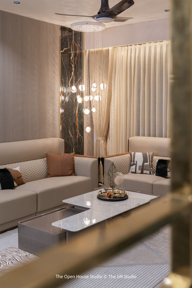Living Room: The sofas are adorned with detailed finishes of veneers and leather, accented with subtle hints of gold, creating a warm and inviting ambiance.